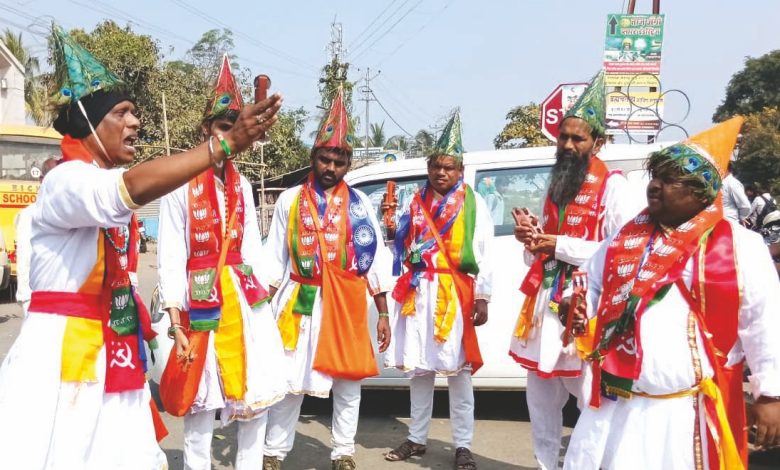 सांगोला : आगामी नगरपालिका निवडणुकीची धामधूम रंगात आली असून सांगोला शहर विकास आघाडी कडून नगराध्यक्ष पदाचे उमेदवार मारुती (आबा) बनकर यांच्या प्रचाराला नवचैतन्य मिळाले आहे. आज त्यांच्या समर्थनार्थ सांगोला शहरात परंपरागत वेशभूषेत वासुदेव अवतरले आणि त्यांनी शहरभर फिरत अनोख्या शैलीत मतदारांना लोकशाहीचे महत्व पटवून देत मारुती आबा बनकर यांच्या प्रचारात भर घालून विजयाचे आवाहन केले.