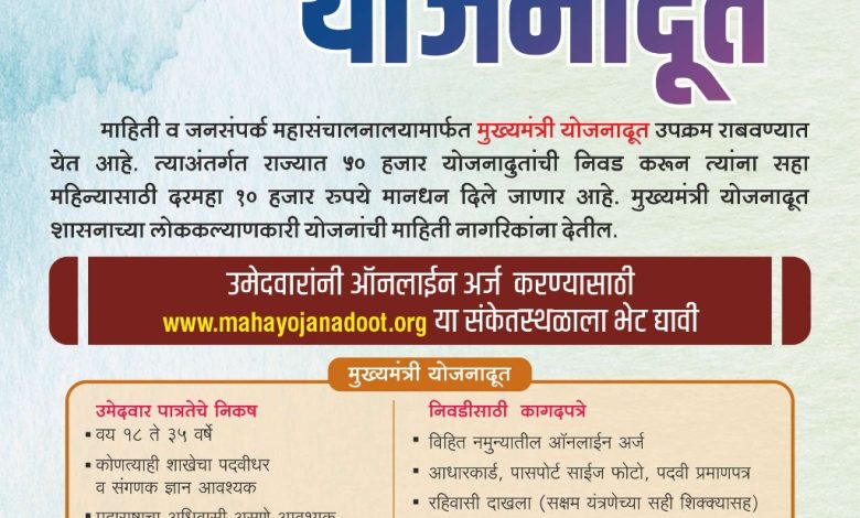 सोलापूर : शासनाच्या विविध योजनांची सर्वसामान्य नागरिकांना माहिती देण्यासाठी मुख्यमंत्री योजनादूत उपक्रम सुरु करण्यात आला आहे. या उपक्रमात सहभागी होण्यासाठी उमेदवारांकडून अर्ज मागविण्यात येत आहेत. इच्छुक उमेदवारांनी www.mahayojanadoot.org या संकेतस्थळावर नोंदणी करण्याचे आवाहन करण्यात येत आहे.