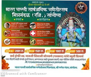 सांगोला : सांगोला शहरातील जुन्या व नामांकित मंडळ असलेल्या भारत गल्ली सार्वजनिक गणेशोत्सव मित्रमंडळाचे यंदाचे हीरक महोत्सवी ६० वे वर्ष असून मंडळाने यंदाच्या वर्षी १५ फुटी उंच सुबक व नयनरम्य अशी देखणी सिंहासनावर बसलेली आणलेली आहे. सन १९६५ मध्ये स्थापना झालेल्या या सार्वजनिक मंडळाचे सांगोला मध्ये मोठे नाव असून मुंबईचा गणपती सांगोल्यात आणून शहरातील गणपती सांगोला सारख्या ग्रामीण भागातील लोकांना पाहता यावे याकरिता या मंडळाने आजपर्यंत अनेक मोठमोठ्या गणपतीच्या सुबक व नयनरम्य मुर्त्या, सजावट, समाज प्रबोधनात्मक सजीव देखावे , थर्माकोलचे म्हैसूर पॅलेस करून सांगोलकरांना मुंबईसारख्या शहरातील मोठ्या गणपतीचा देखावा आजपर्यंत सादर केलेला आहे.